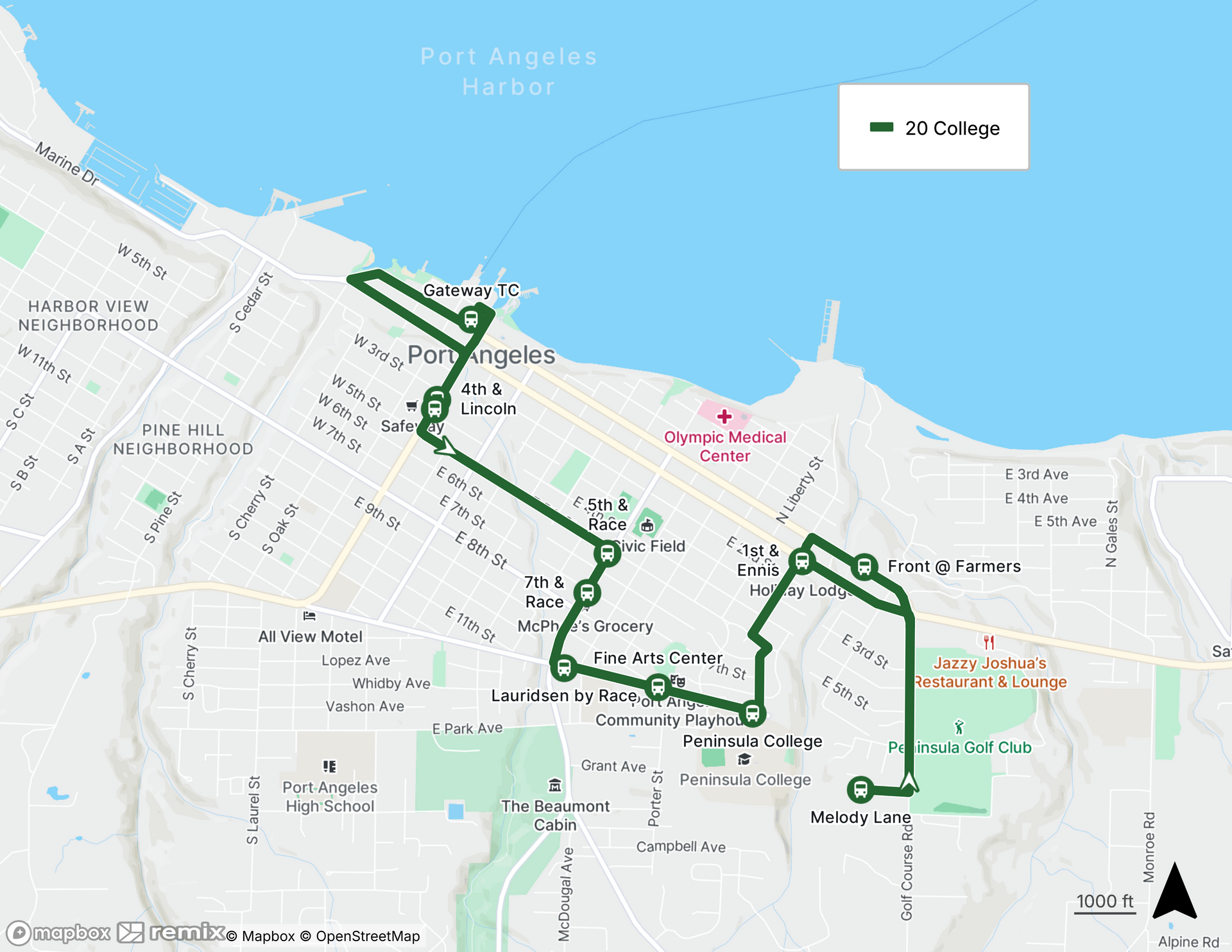 | Melody Lane | Front & Farmers | Peninsula College | Fine Arts Center | 7th & Race | Lincoln & 4th | Gateway Transit Center |